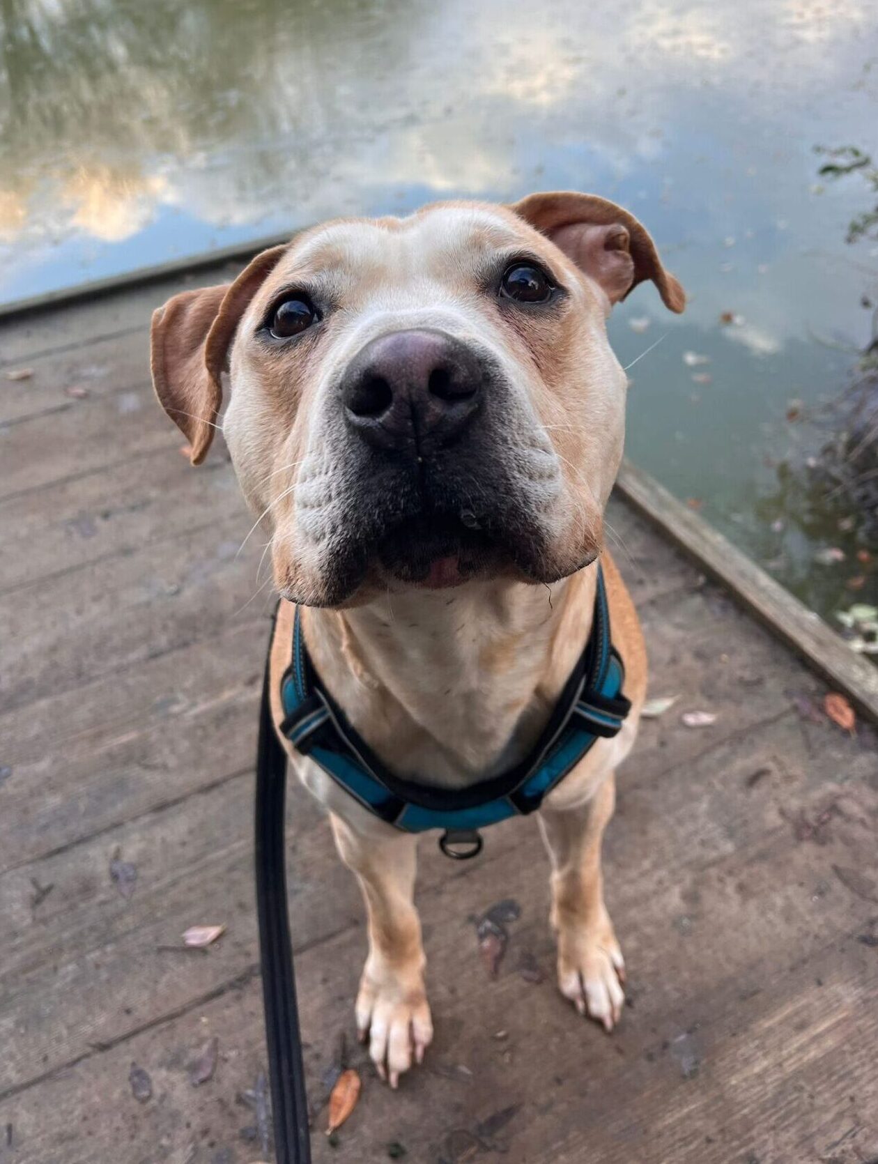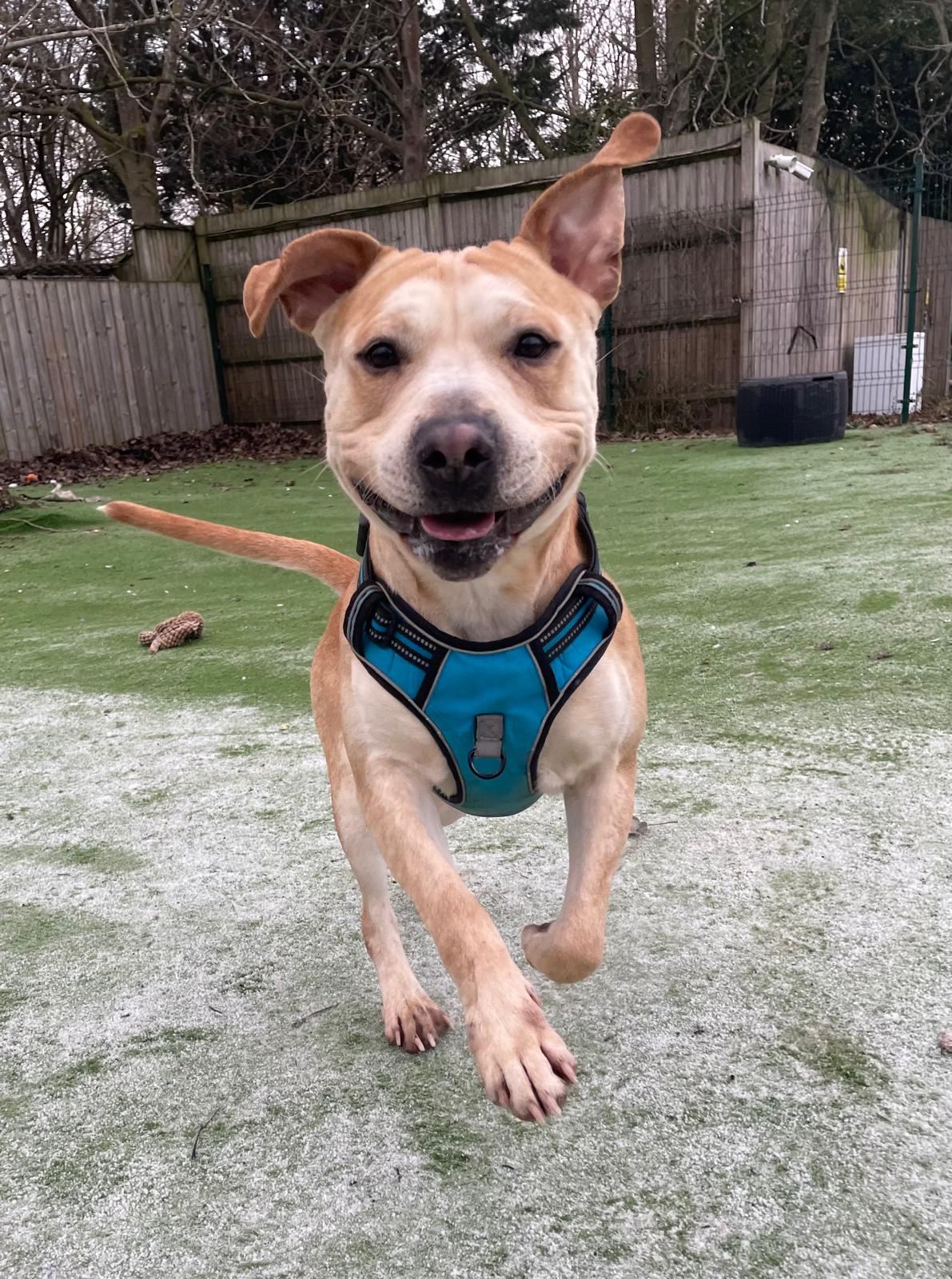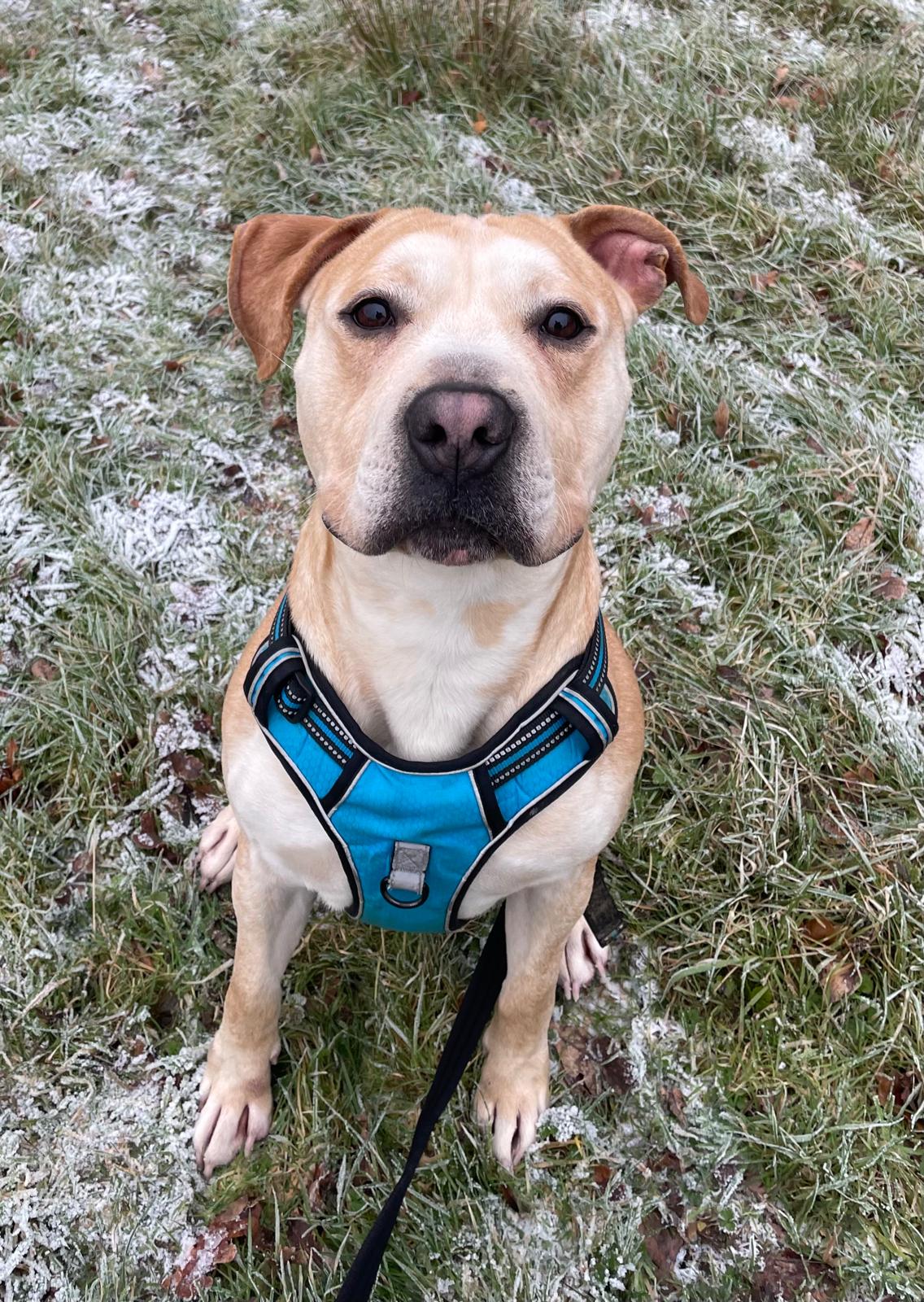 Gorgeous Milo came to us after he was sadly abandoned. He’s a friendly boy, and has been sweet with all of the staff at kennels. He seems to like other dogs and making friends out and about. He would like a home with an owner that has had dogs before (ideally bull breeds), and a garden of his own to run about in (no communal gardens). He will need owners that are around for a large portion of the day to help him settle in.